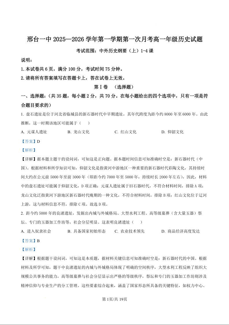 河北省邢台市第一中学2025-2026学年高一上学期9月月考 历史答案.docx