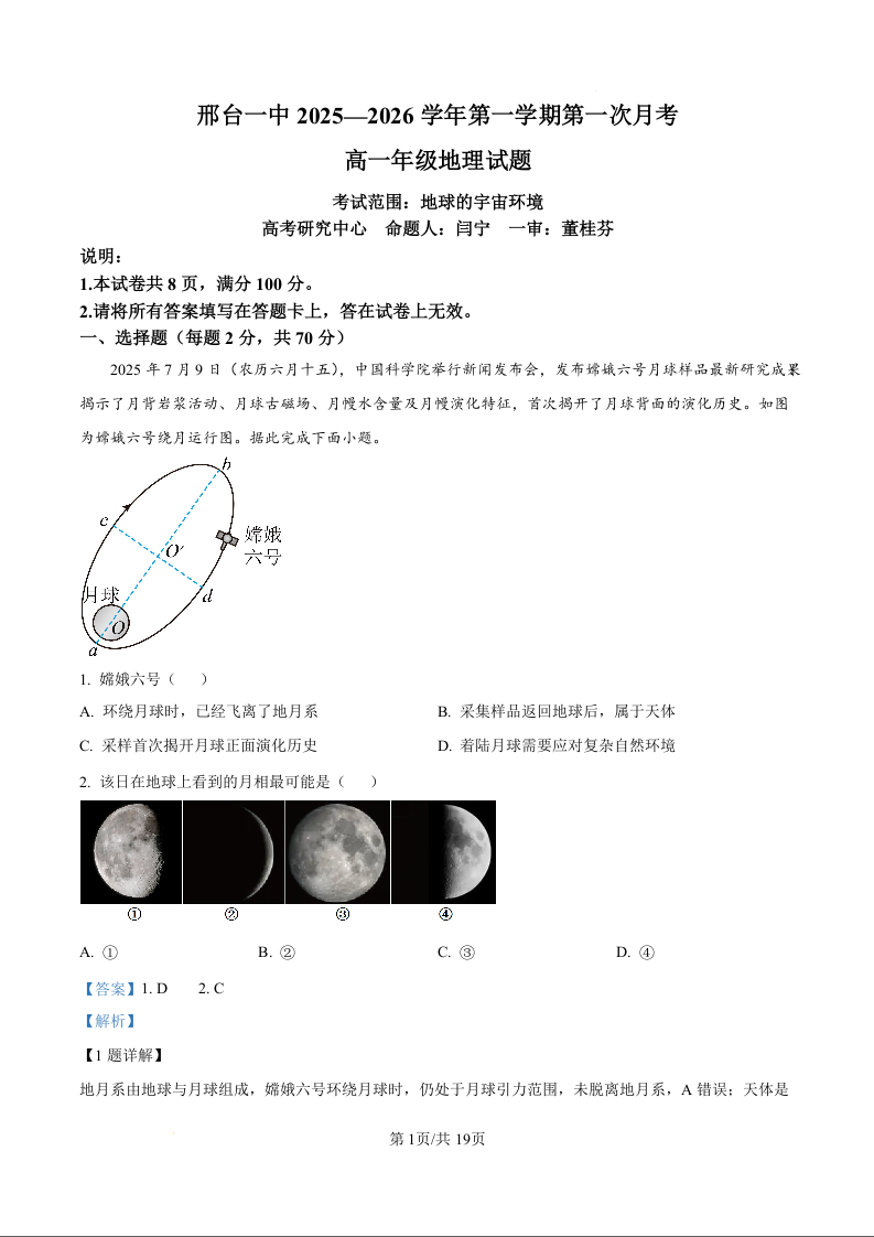 河北省邢台市第一中学2025-2026学年高一上学期9月月考 地理答案.docx