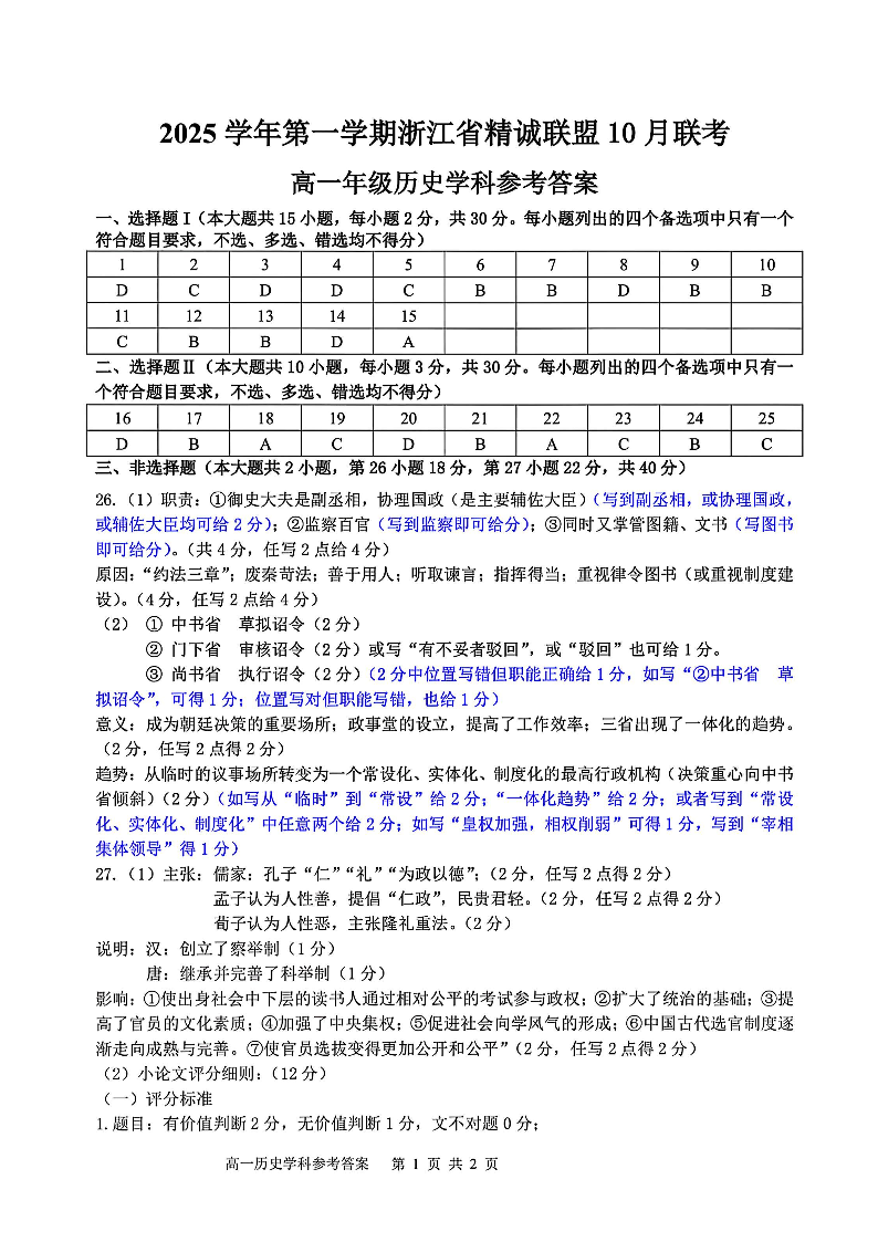 2025学年第一学期浙江省精诚联盟10月联考 历史答案.pdf