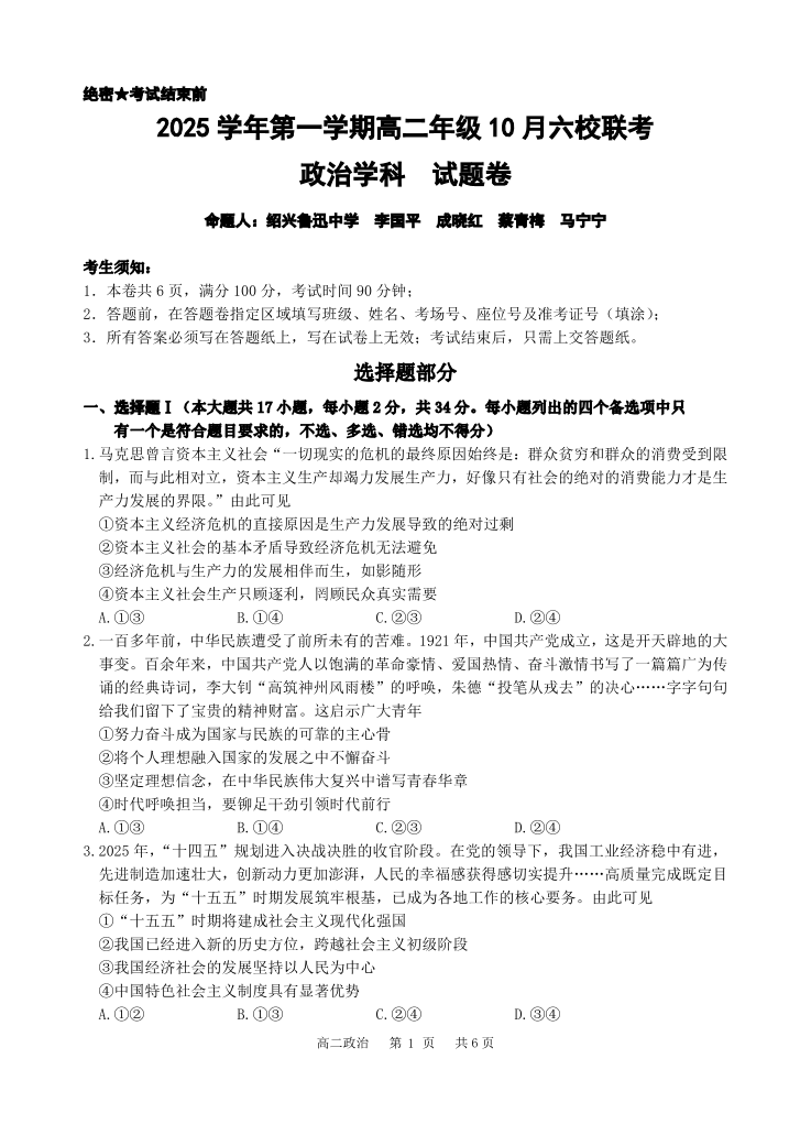 2025学年第一学期高二年级10月六校联考 政治.pdf