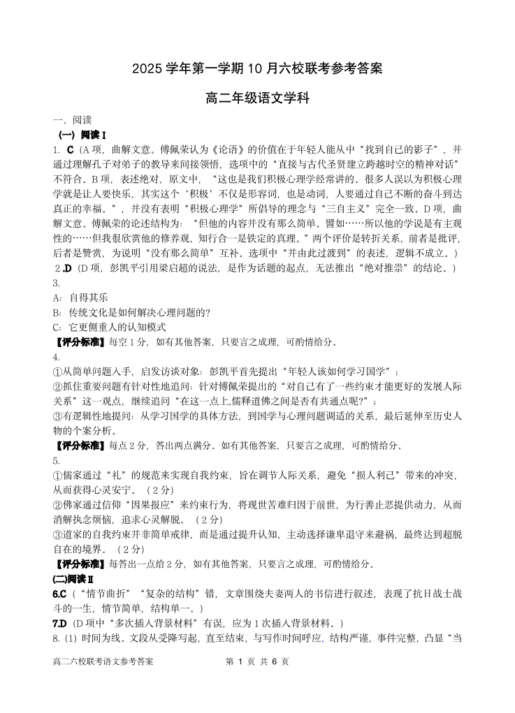 2025学年第一学期高二年级10月六校联考 语文答案.pdf