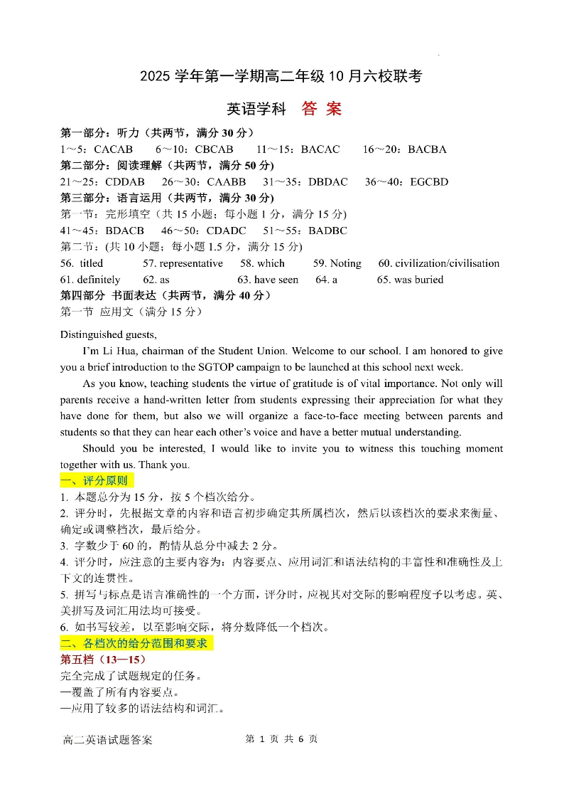 2025学年第一学期高二年级10月六校联考 英语答案.pdf