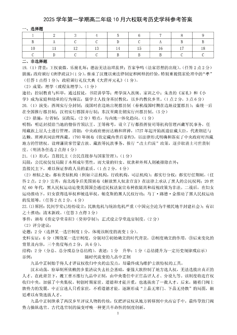 2025学年第一学期高二年级10月六校联考 历史答案.pdf