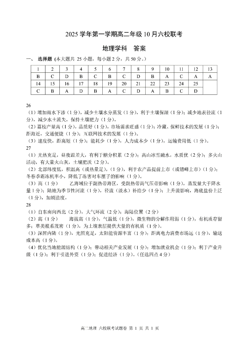 2025学年第一学期高二年级10月六校联考 地理答案.pdf