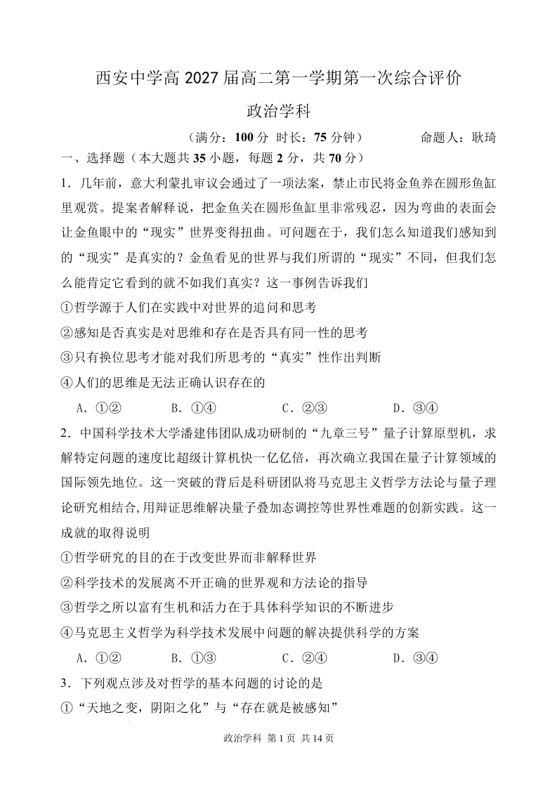陕西省西安中学2025-2026学年高二上学期第一次综合评价 政治.docx