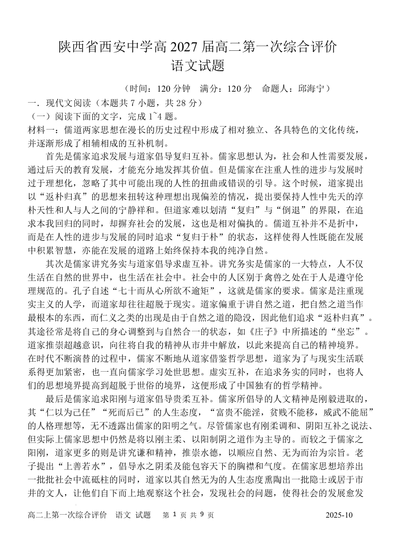 陕西省西安中学2025-2026学年高二上学期第一次综合评价 语文.docx