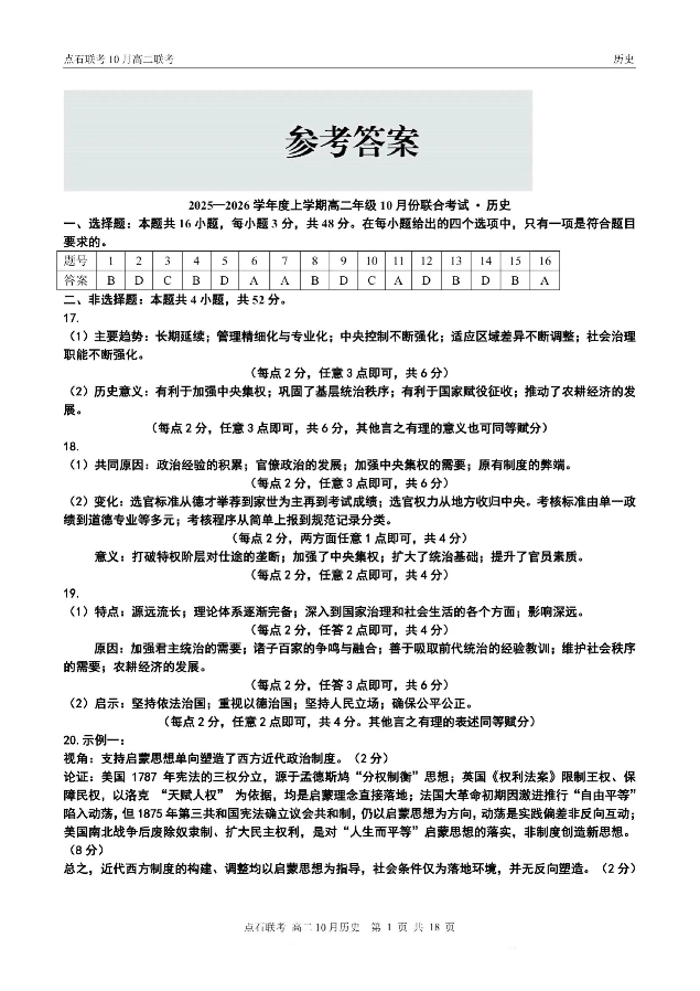 辽宁省点石联考2025-2026学年上学期高二年级10月份联合考试 历史答案.pdf