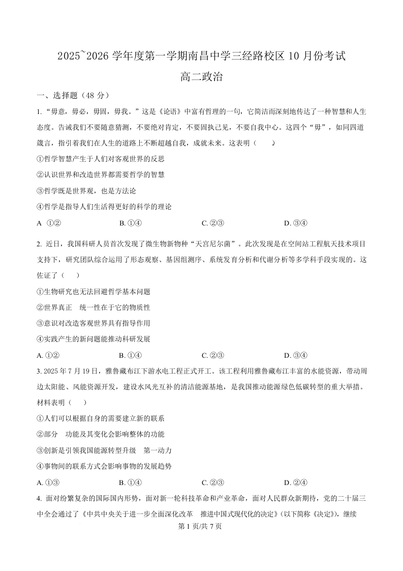 江西省南昌中学(三经路校区)2025-2026学年高二上学期10月月考 政治.docx