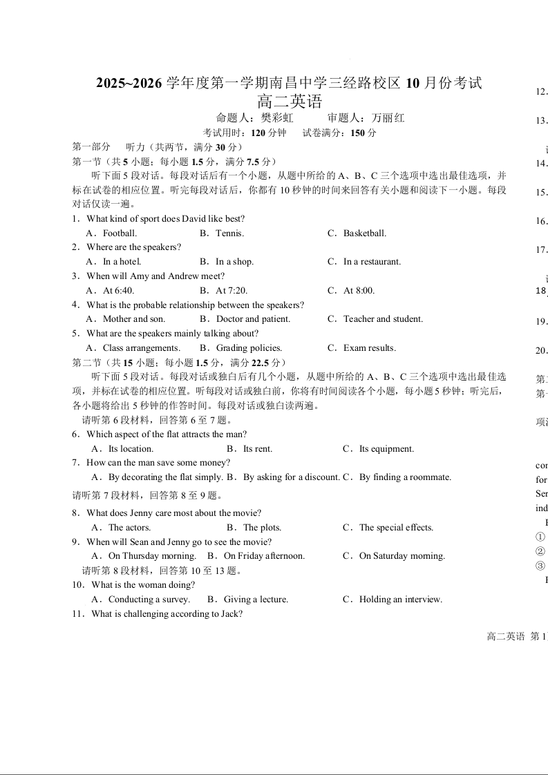 江西省南昌中学(三经路校区)2025-2026学年高二上学期10月月考 英语试题(含答案).docx