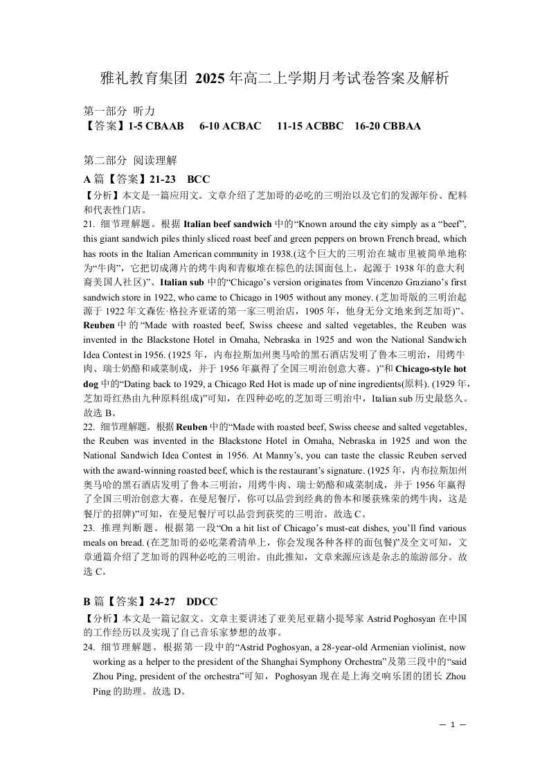湖南省长沙市雅礼中学2025-2026学年高二上学期第一次(10月)质量检测 英语答案.docx