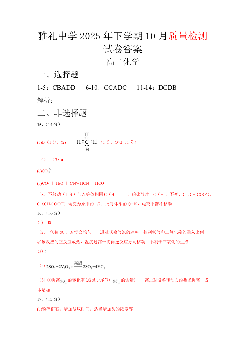 湖南省长沙市雅礼中学2025-2026学年高二上学期第一次(10月)质量检测 化学答案.docx
