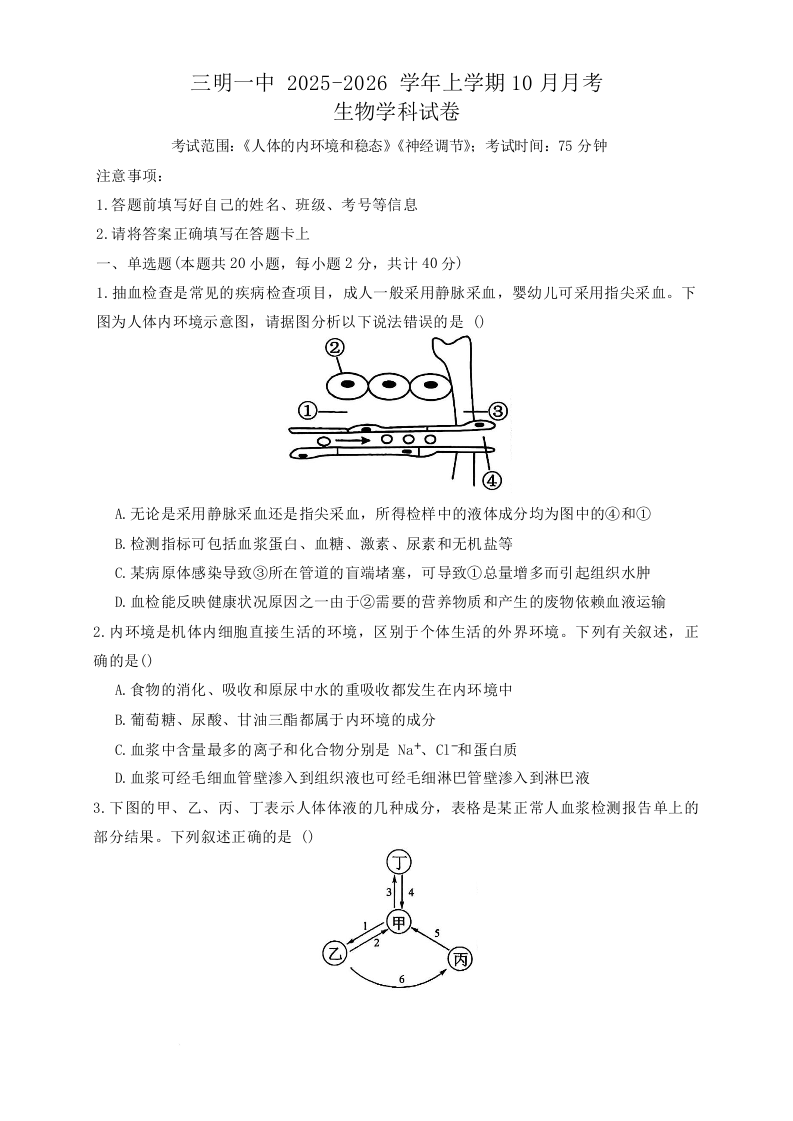 福建省三明第一中学2025-2026学年高二上学期10月月考 生物试题(含答案).docx