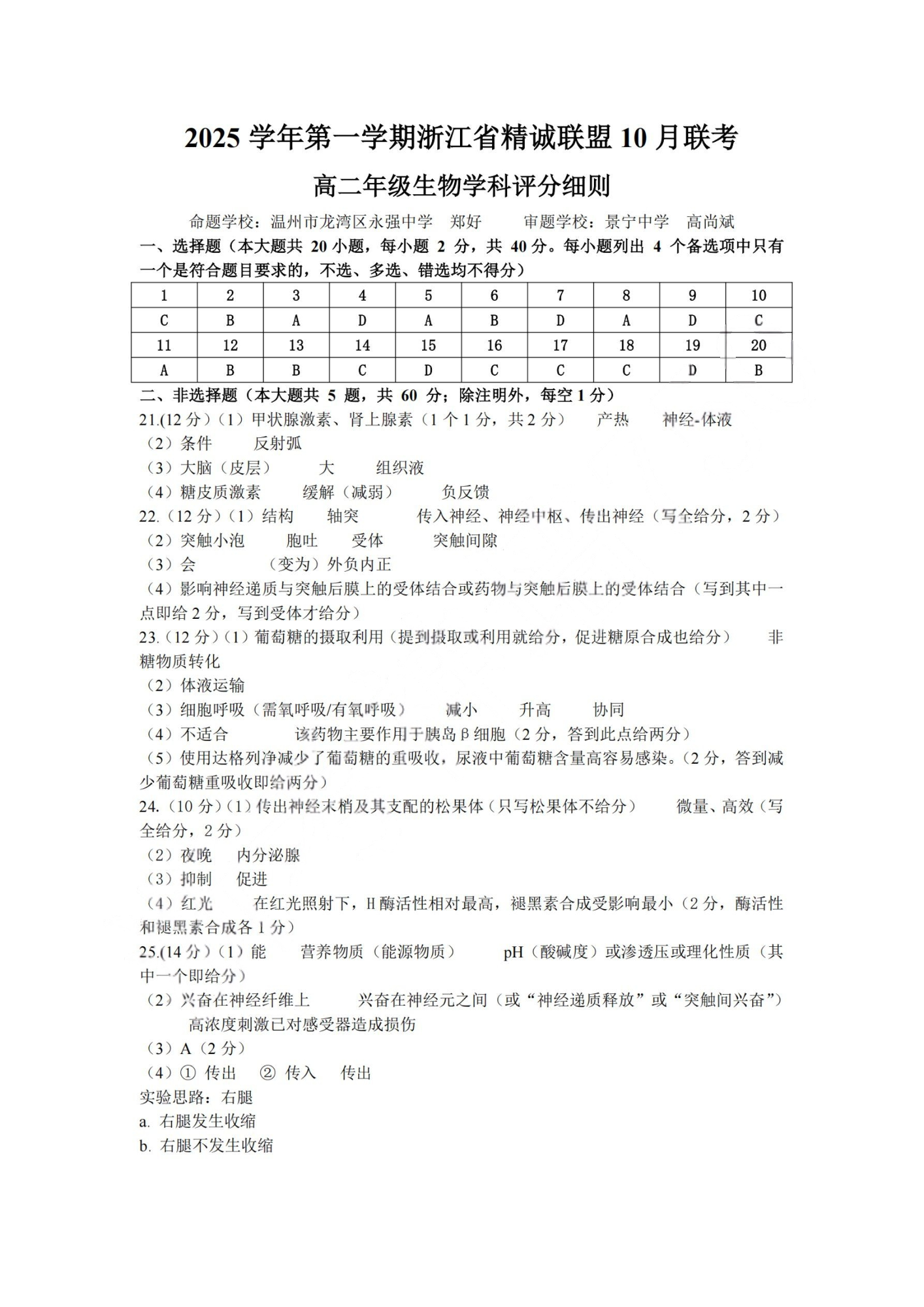 2025学年第一学期浙江省精诚联盟高二年级10月联考 生物答案.pdf