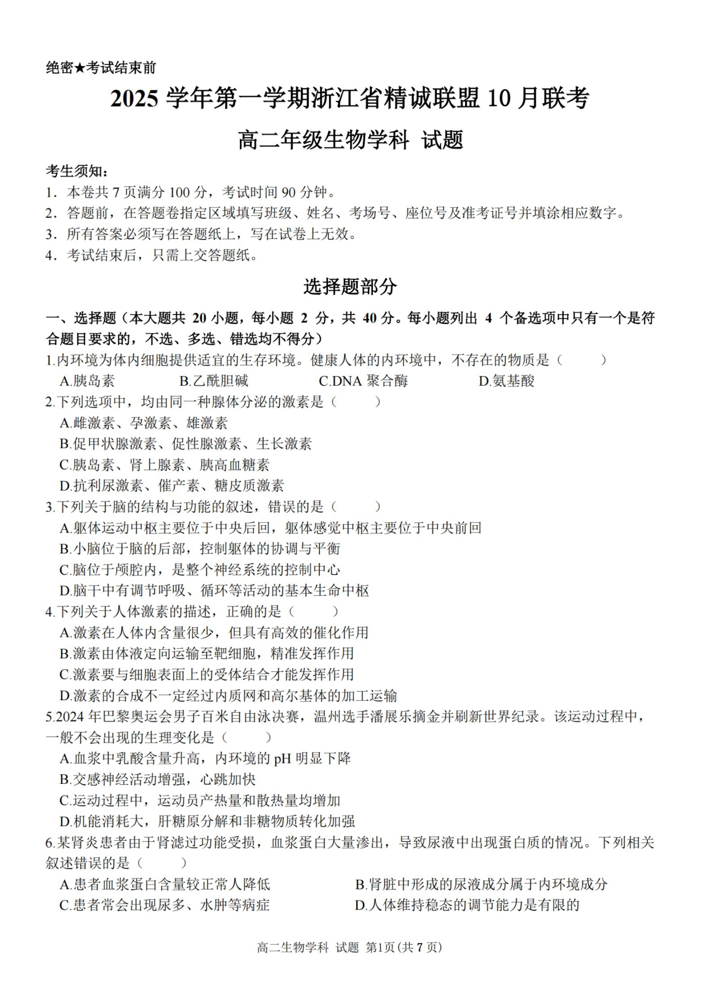 2025学年第一学期浙江省精诚联盟高二年级10月联考 生物.pdf