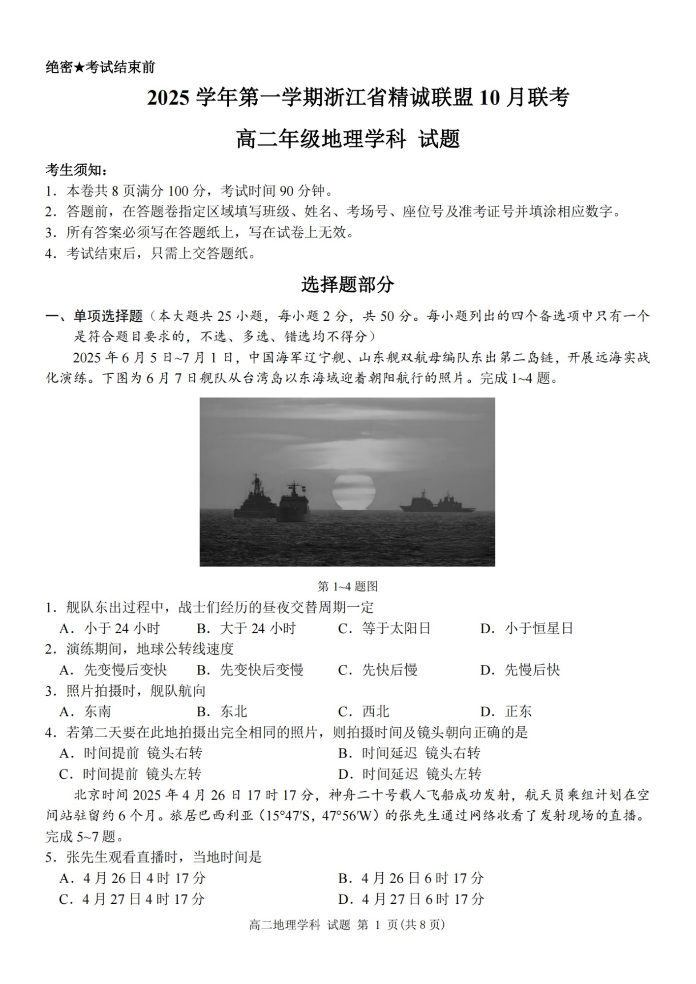 2025学年第一学期浙江省精诚联盟高二年级10月联考 地理.pdf