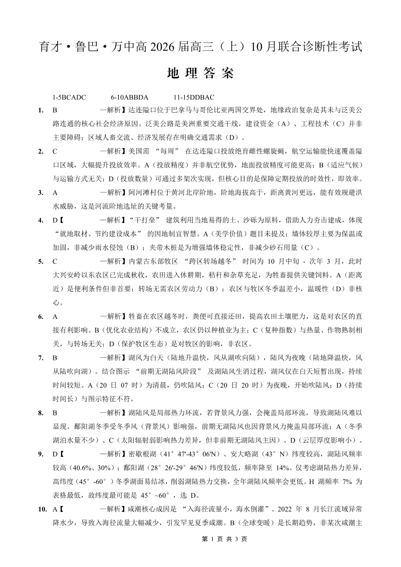 育才·鲁巴·万中高2026届高三(上)10月联合诊断性考试 地理答案.pdf