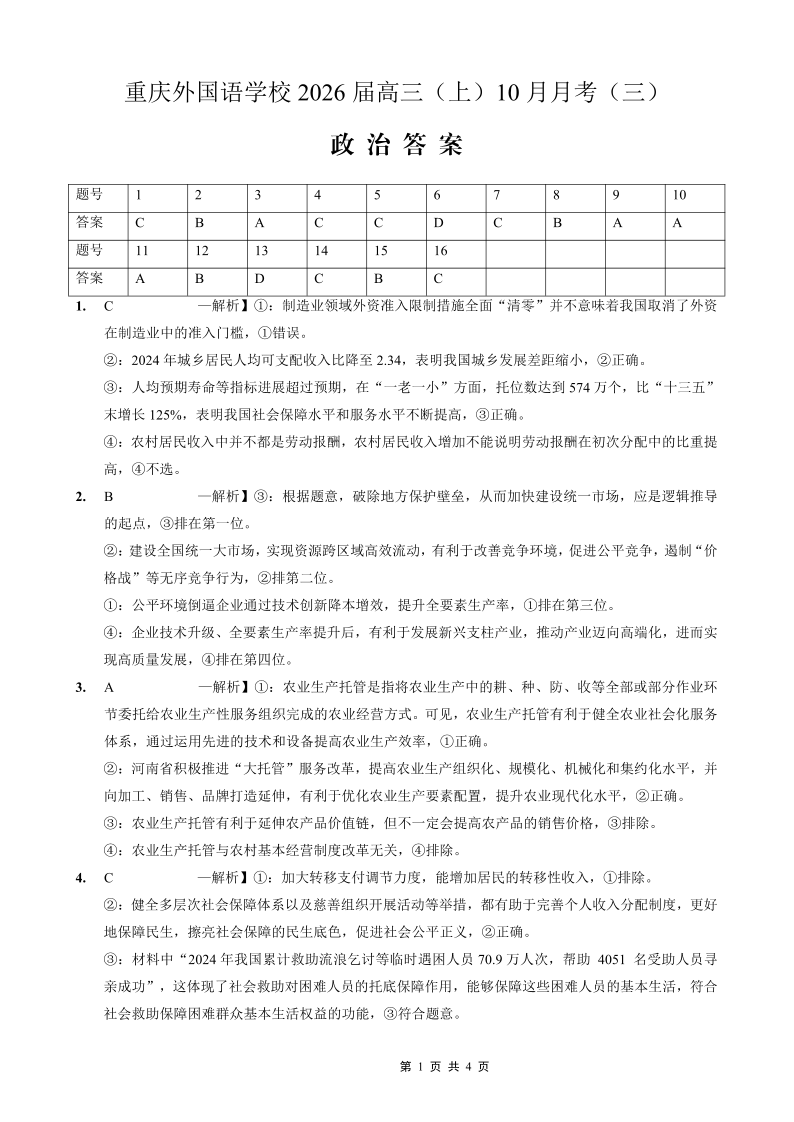 重庆外国语学校高2026届高三(上)10月月考(三)政治答案.pdf