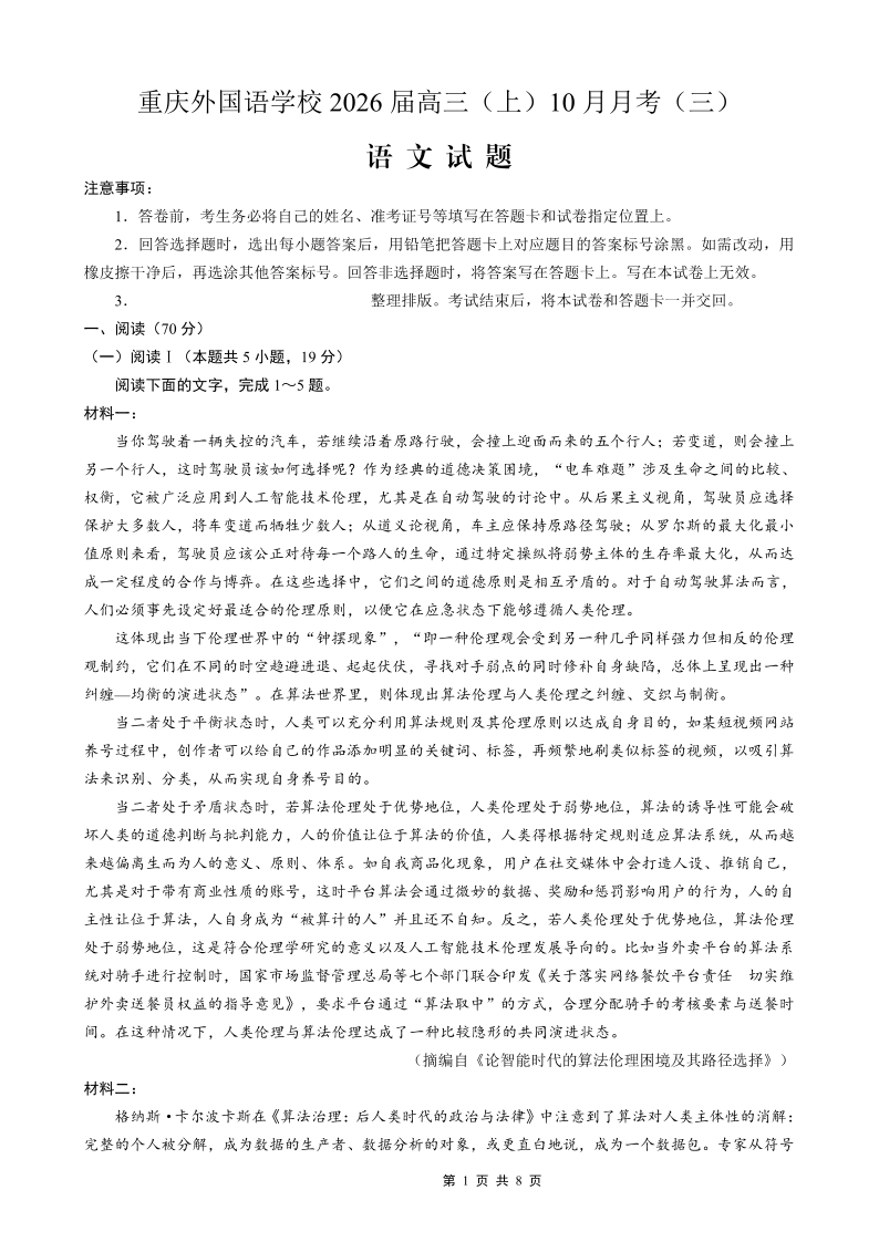 重庆外国语学校高2026届高三(上)10月月考(三)语文.pdf