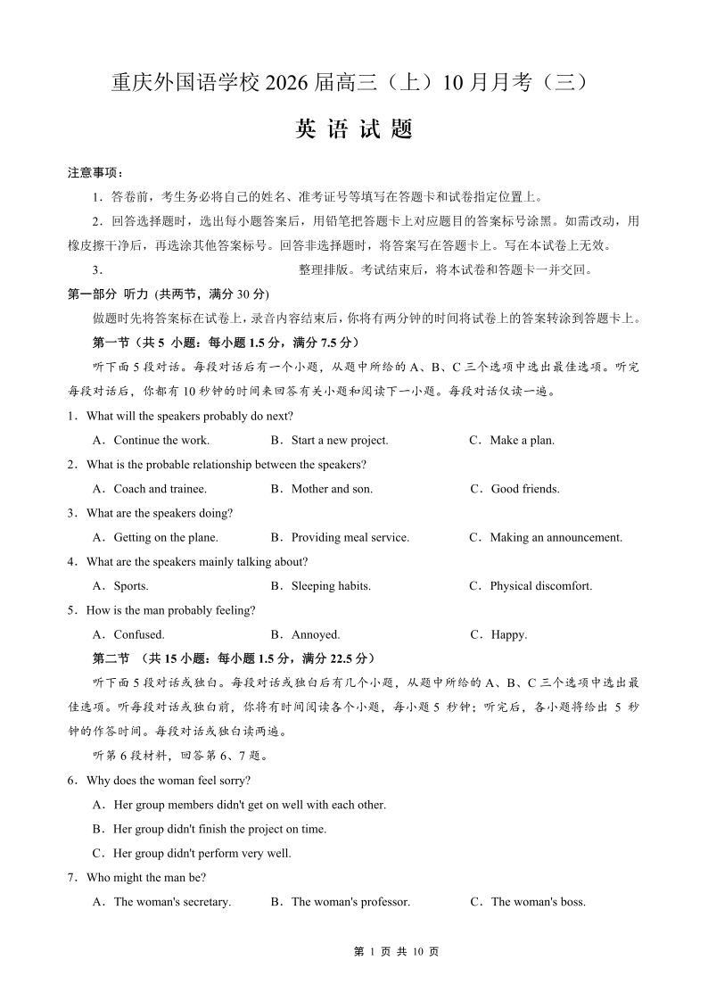 重庆外国语学校高2026届高三(上)10月月考(三)英语.pdf