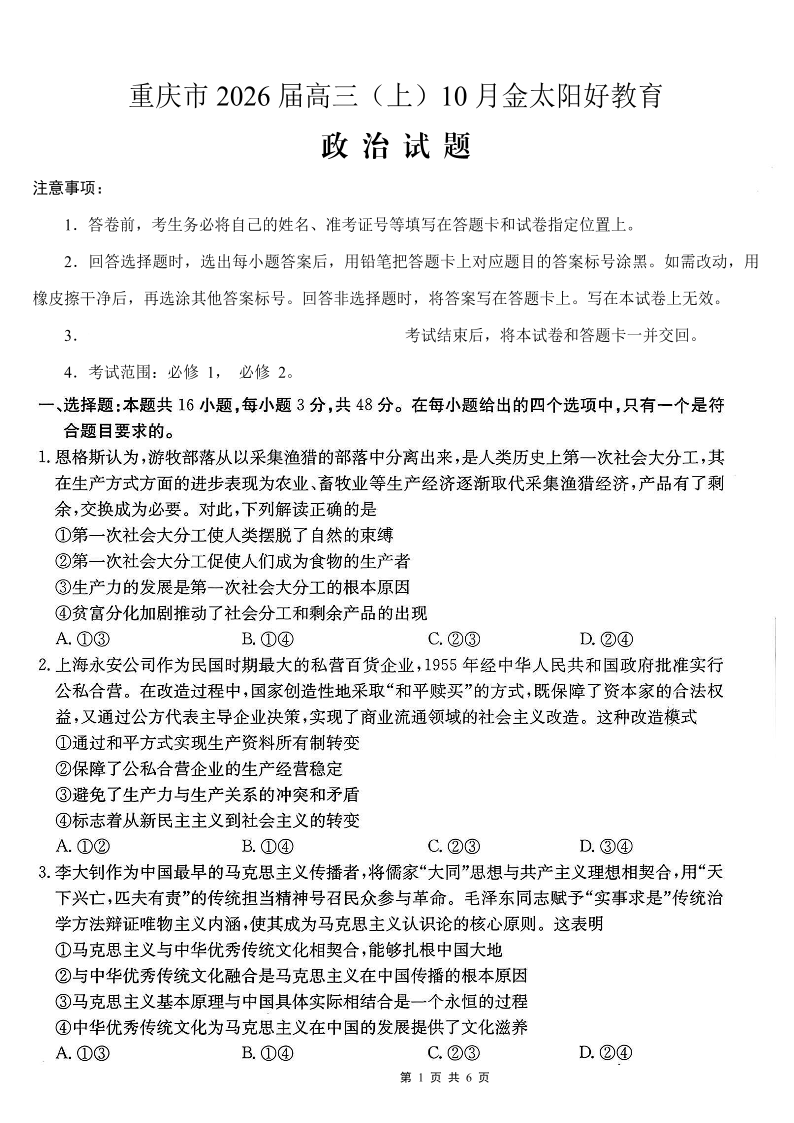 重庆市好教育联盟2026届高三(上)10月联考 政治.pdf