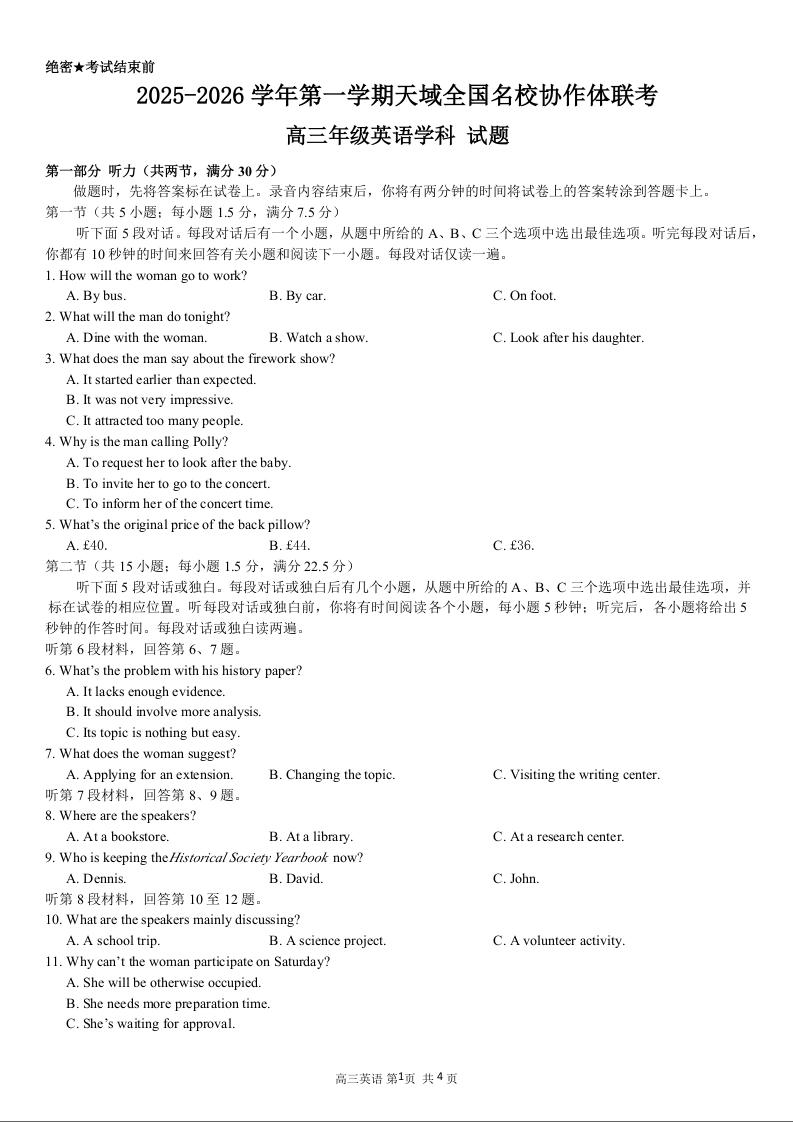 2025-2026学年第一学期天域全国名校协作体联考 英语听力录音材料.docx