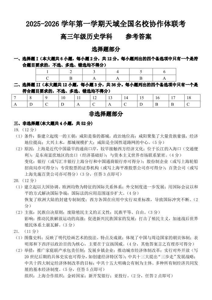 2025-2026学年第一学期天域全国名校协作体联考 历史答案.pdf