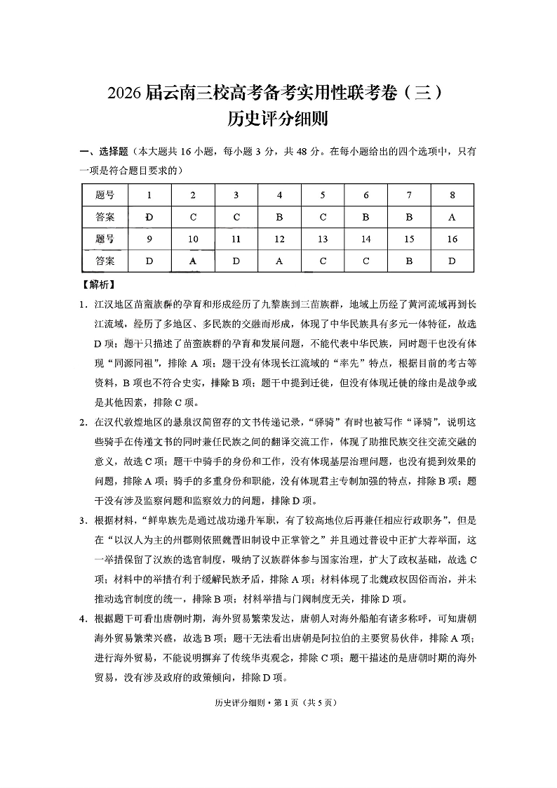 2026届云南三校高考备考实用性联考卷(三)历史答案.pdf