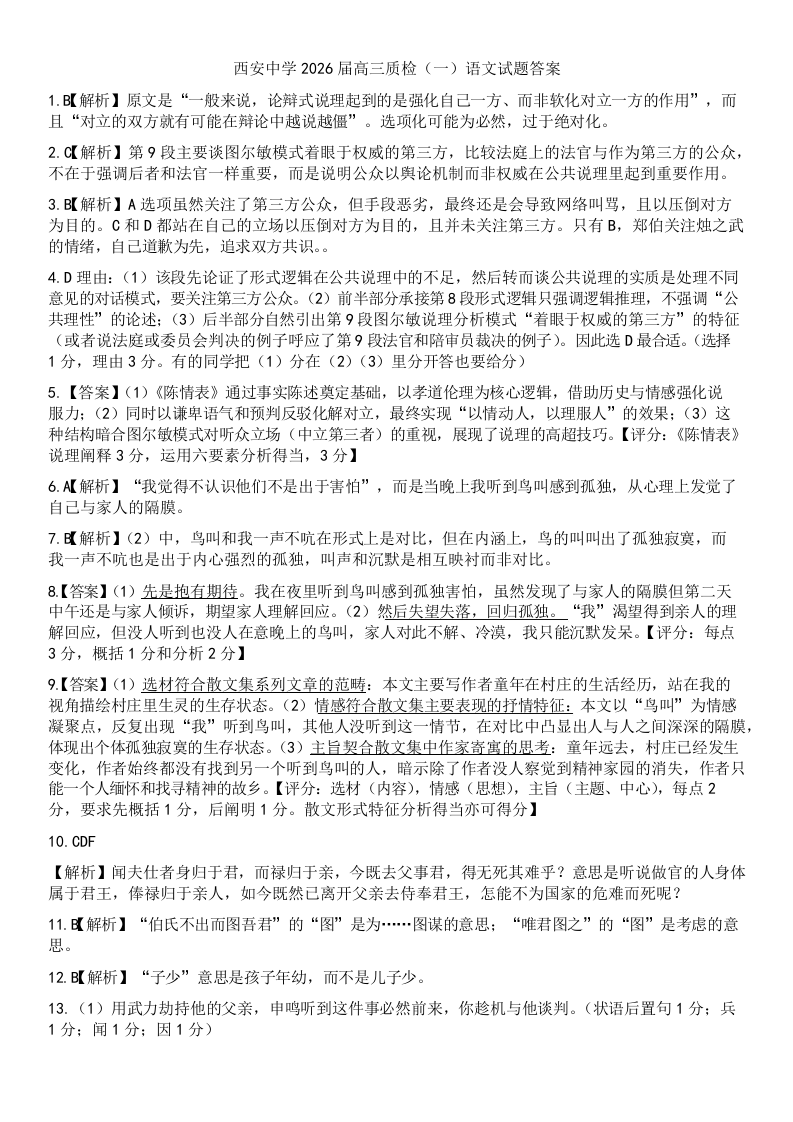 陕西省西安中学2026届高三上学期10月质量检测考试(一)语文答案.docx