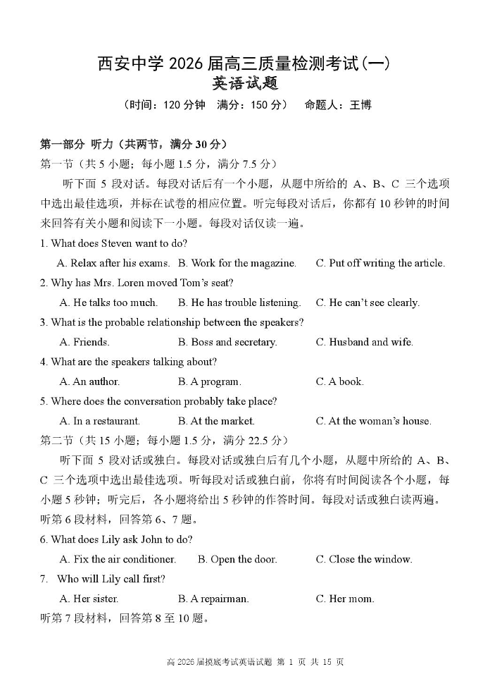 陕西省西安中学2026届高三上学期10月质量检测考试(一)英语.pdf