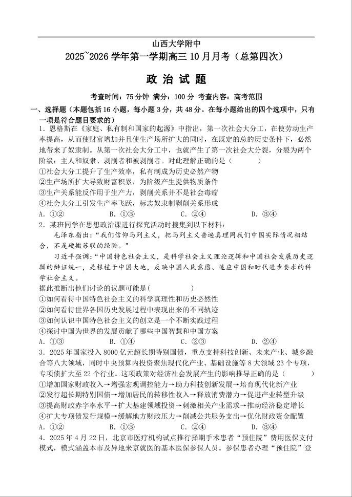 山西大学附属中学校2025-2026学年高三上学期10月模块诊断(总第四次)政治.docx