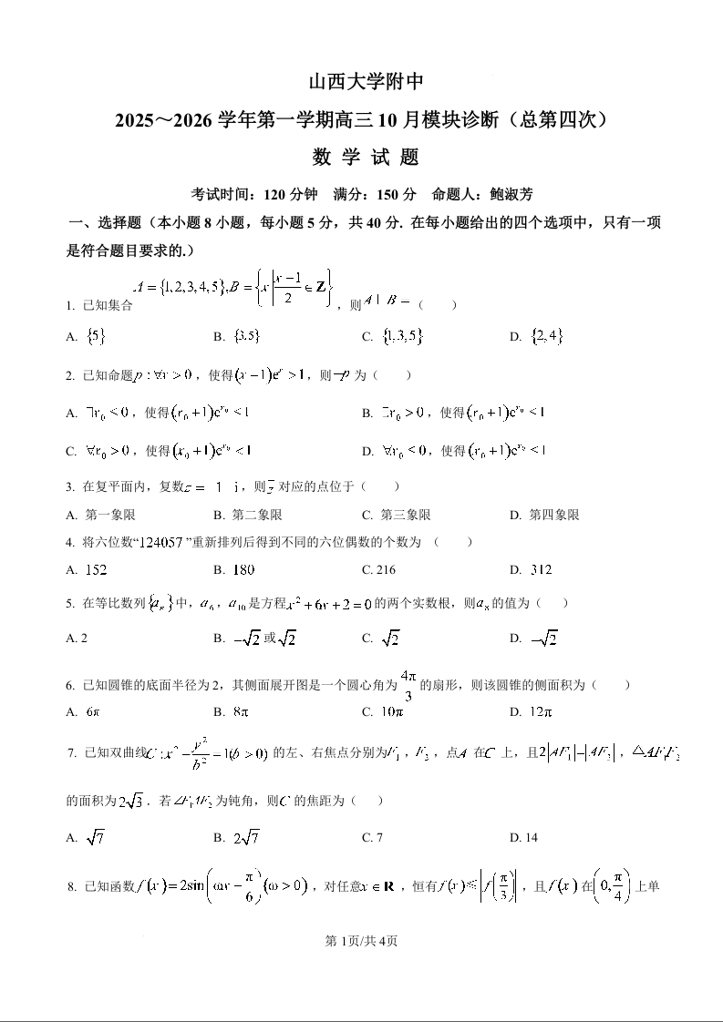 山西大学附属中学校2025-2026学年高三上学期10月模块诊断(总第四次)数学.docx
