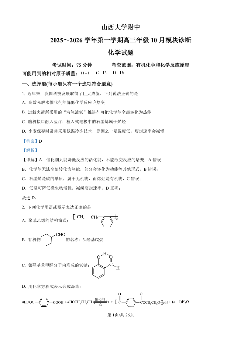 山西大学附属中学校2025-2026学年高三上学期10月模块诊断(总第四次)化学答案.docx