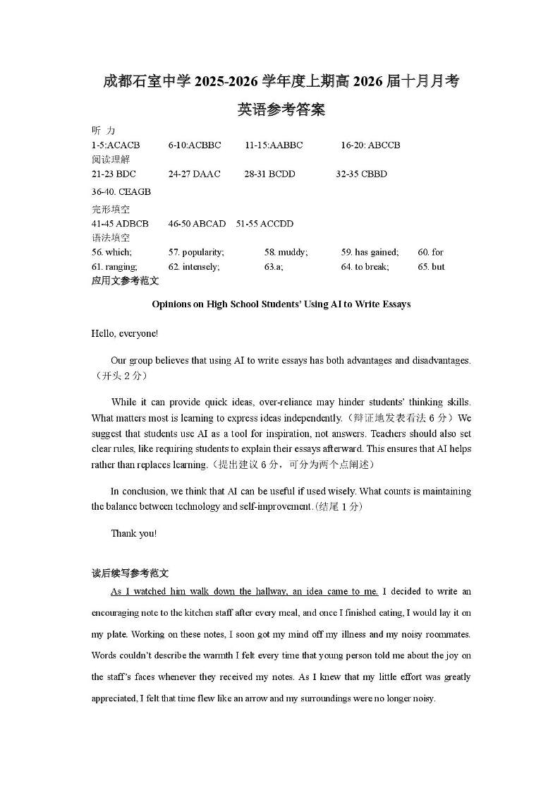 四川省成都市石室中学2025-2026学年高三上学期10月月考 英语答案.pdf
