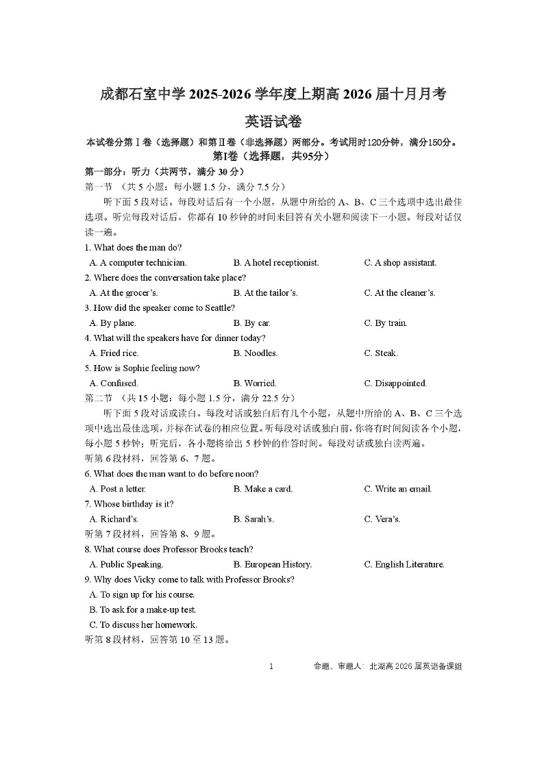 四川省成都市石室中学2025-2026学年高三上学期10月月考 英语.pdf