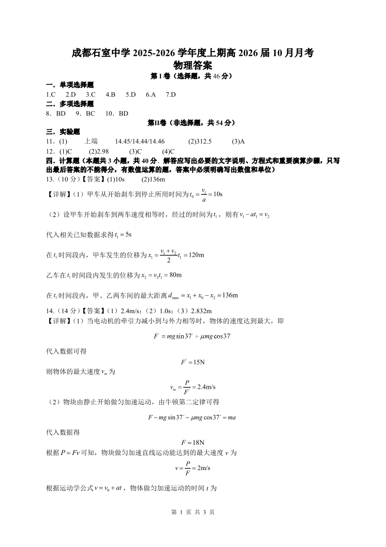 四川省成都市石室中学2025-2026学年高三上学期10月月考 物理答案.pdf