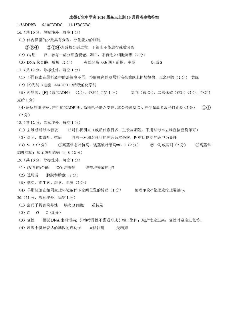 四川省成都市石室中学2025-2026学年高三上学期10月月考 生物答案.pdf