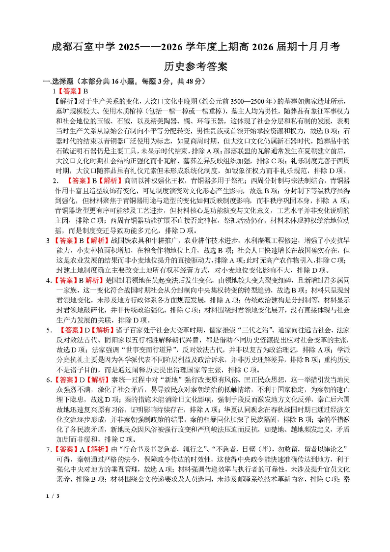 四川省成都市石室中学2025-2026学年高三上学期10月月考 历史答案.pdf