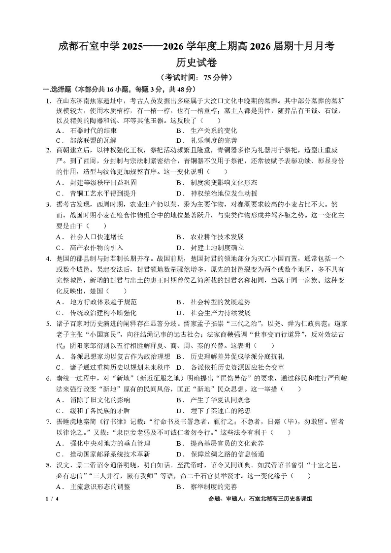 四川省成都市石室中学2025-2026学年高三上学期10月月考 历史.pdf