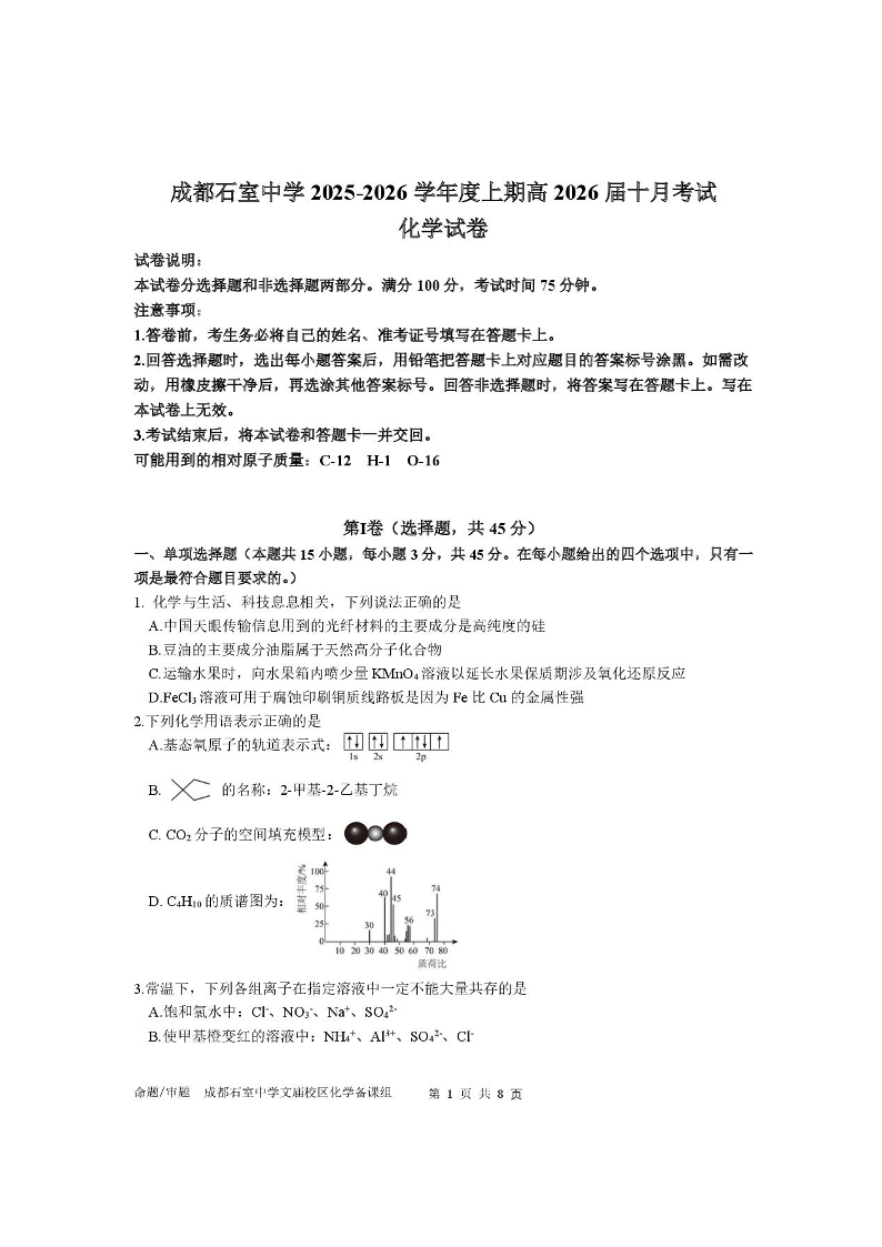 四川省成都市石室中学2025-2026学年高三上学期10月月考 化学.pdf