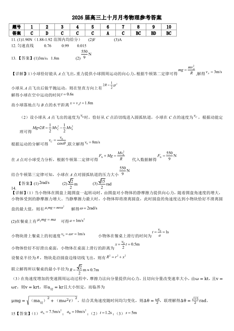 四川省成都市第七中学2025-2026学年高三上学期十月阶段性检测 物理答案.pdf
