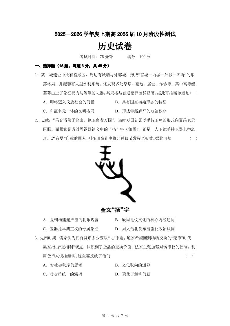 四川省成都市第七中学2025-2026学年高三上学期十月阶段性检测 历史.pdf