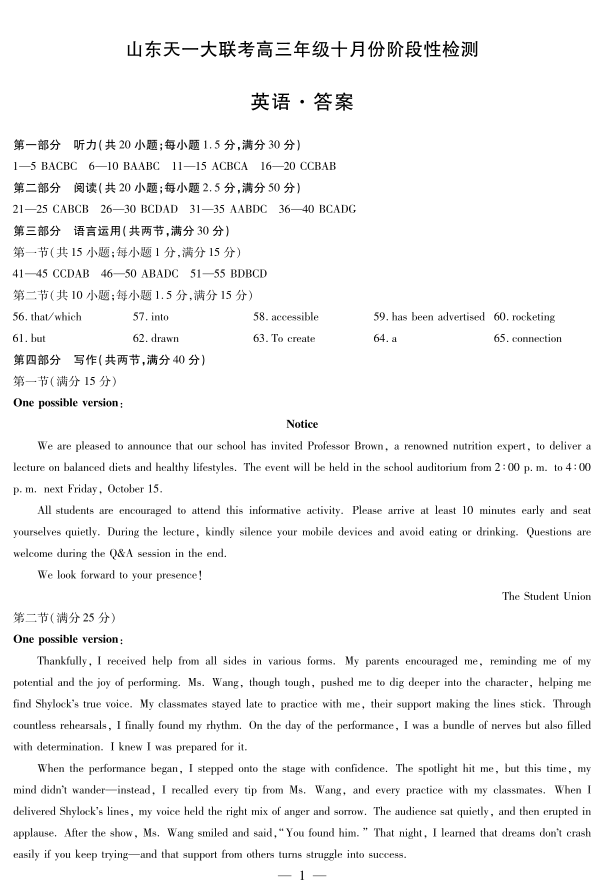 英语山东高三年级十月份阶段性检测答案.pdf
