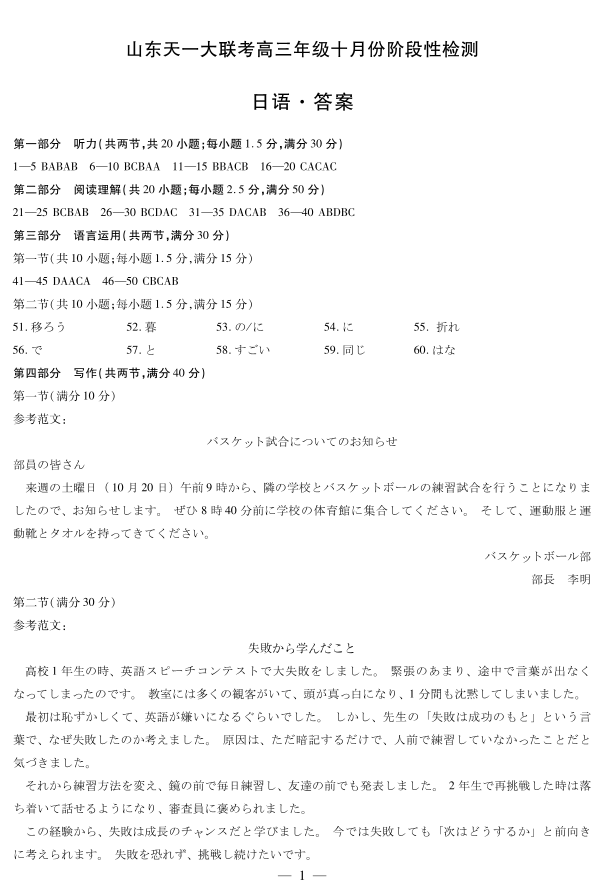日语山东高三年级十月份阶段性检测答案.pdf
