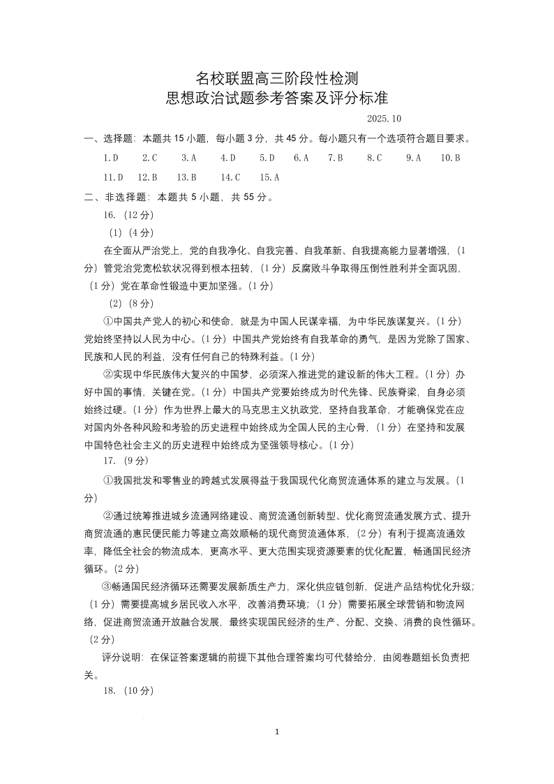 山东名校考试联盟2025年10月高三年级阶段性检测 政治答案.pdf