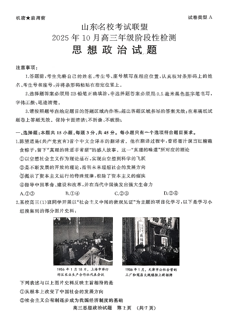 山东名校考试联盟2025年10月高三年级阶段性检测 政治.pdf