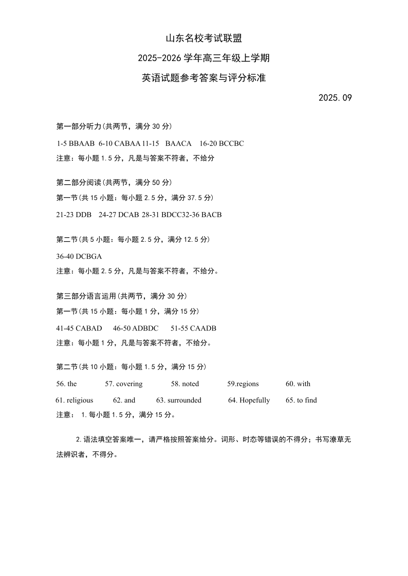 山东名校考试联盟2025年10月高三年级阶段性检测 英语答案.pdf