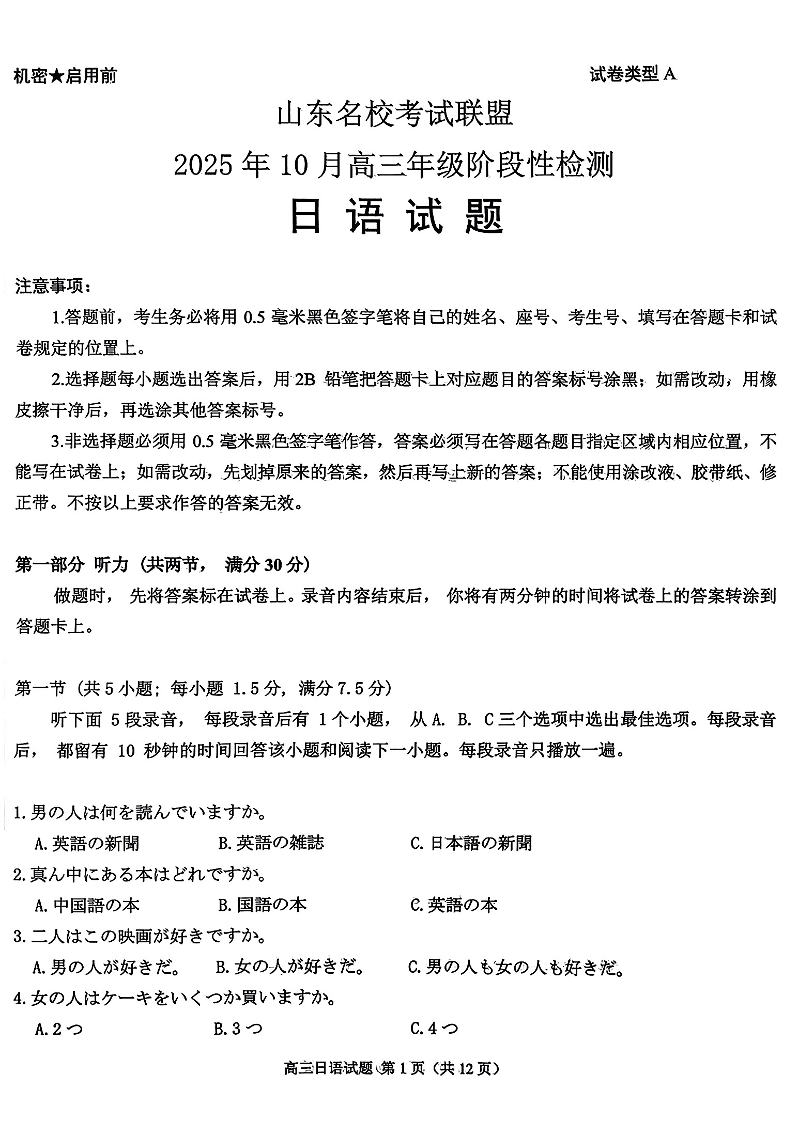 山东名校考试联盟2025年10月高三年级阶段性检测 日语.pdf