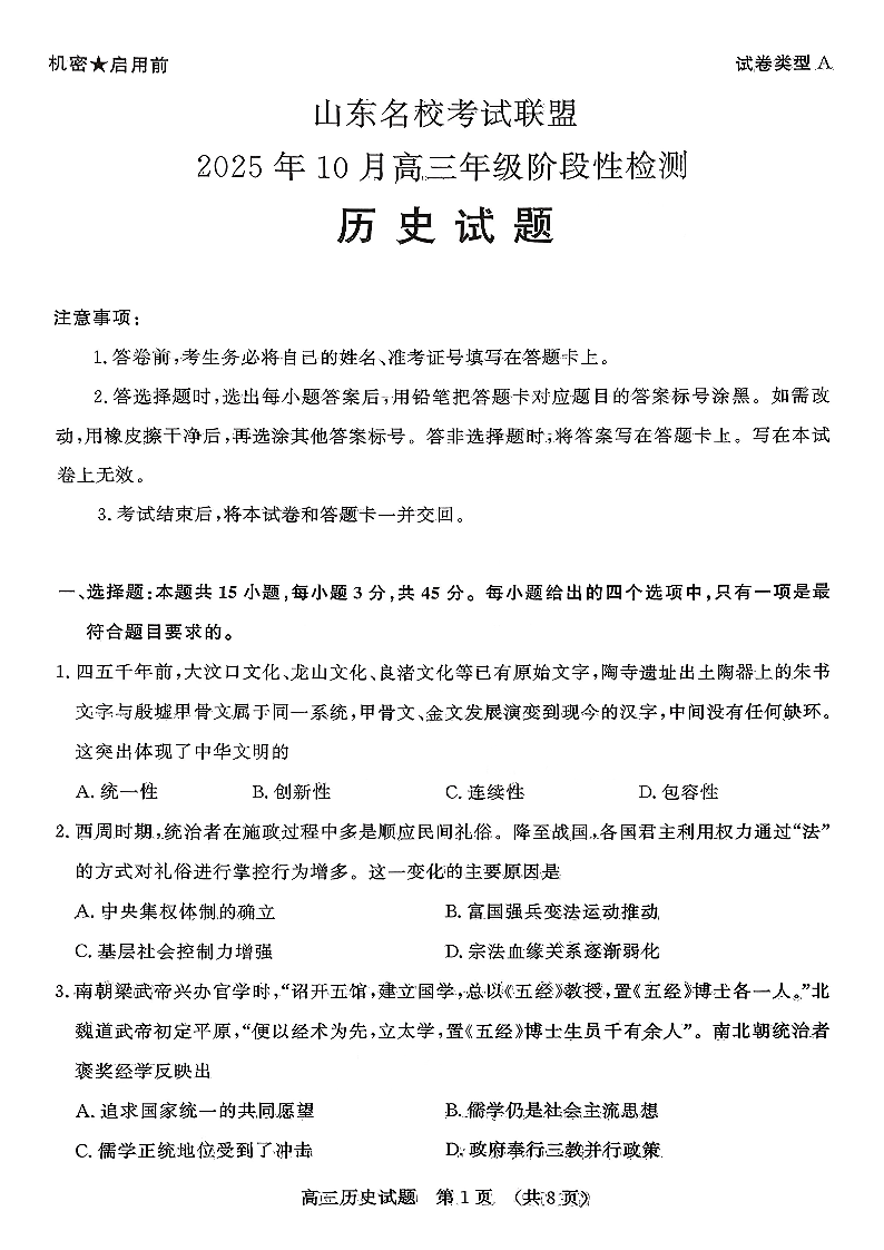 山东名校考试联盟2025年10月高三年级阶段性检测 历史.pdf