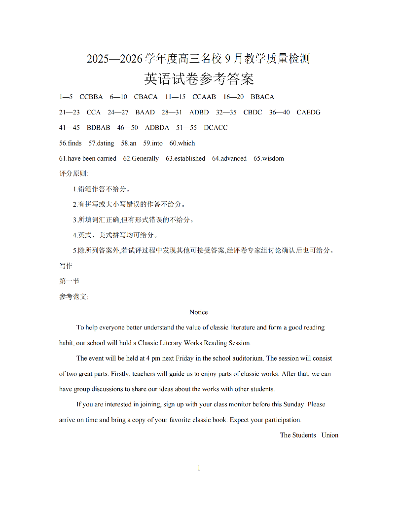 内蒙古2026届高三名校9月教学质量检测试卷 英语答案.pdf