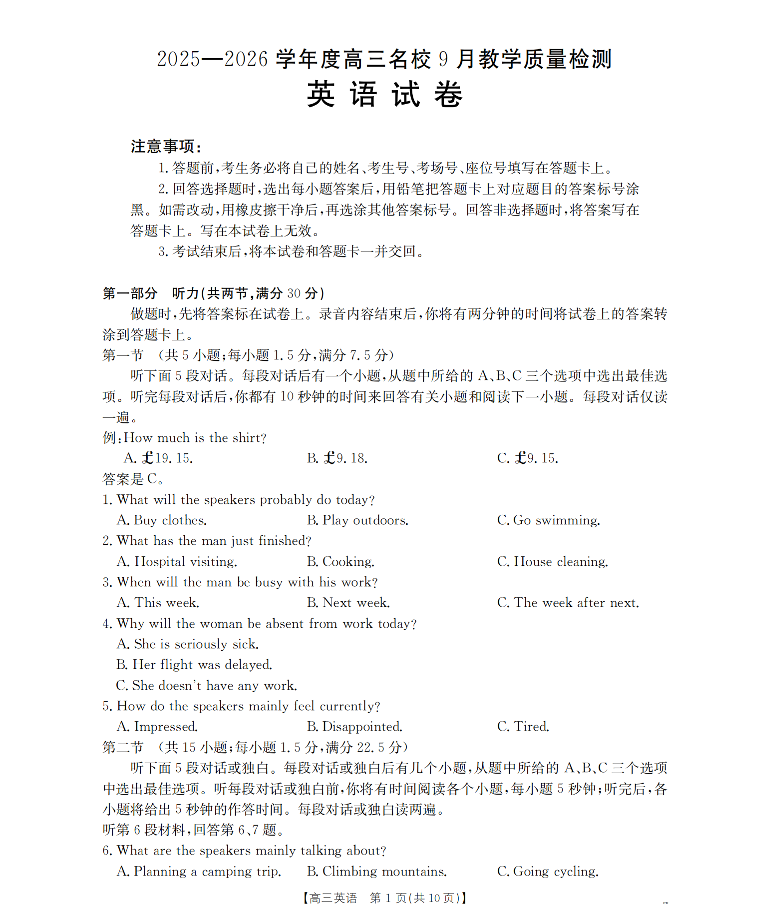 内蒙古2026届高三名校9月教学质量检测试卷 英语.pdf